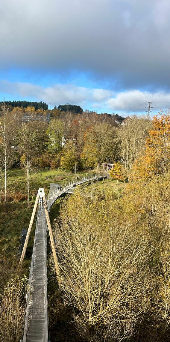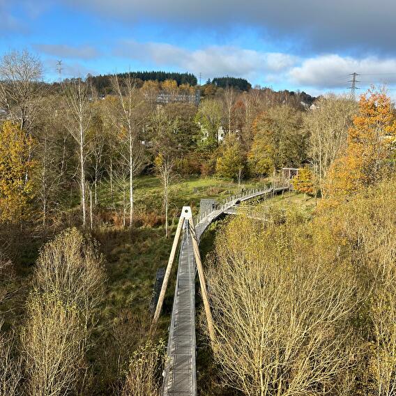 The trail first leads you to the Passerelle des Oiseaux, an impressive 150-meter wooden suspended structure overlooking the Sûre River. Throughout the route, informative panels reveal the secrets of the local wildlife, and an observation tower offers breathtaking panoramic views of the valley.