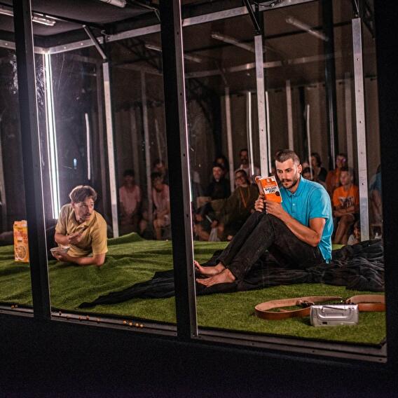Under the amused gaze of the audience, two beings come face to face inside a glass box. Like laboratory mice, they sniff each other out, noses resting on each other’s backs, ignoring, spying, and nudging one another. With a poetic blend of tender struggles and clumsy waltzes, they will advance like tightrope walkers on the unstable ladder of feelings and emotions...