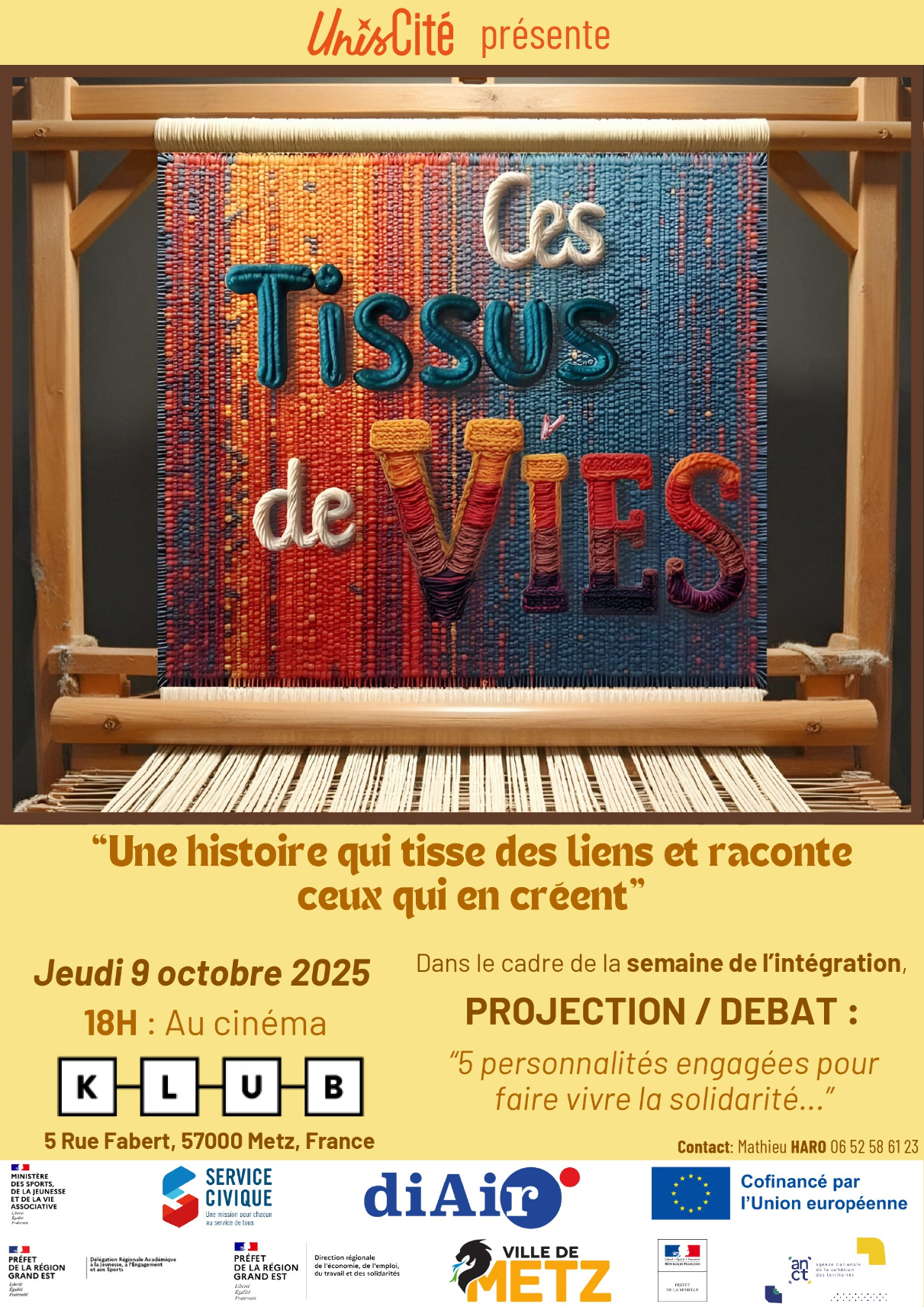 • 2025-10-09 18:00:00 2025-10-09 20:00:00 Europe/Paris Screening-Debate "Ces Tissus de Vies" As part of Integration Week, Unis-Cité Metz invites the public to view its film "Ces Tissus de Vies," created in May 2025 with a team of civic service volunteers that included refugees and French speakers. The film cross-examines the portraits of 5 committed individuals working to foster solidarity within local communities, tackling civil themes such as commitment, exile, welcoming, and integration. The screening will be followed by a discussion with the production team. 5, Place Saint-Jacques, 57000 Metz, France KLUB Metz