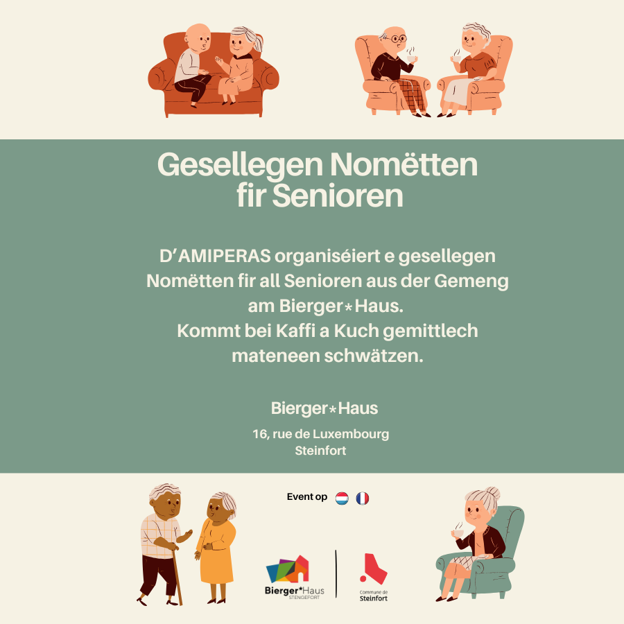 • 2025-10-29 15:00:00 2025-10-29 18:00:00 Europe/Paris Afternoon Gathering for Seniors A warm afternoon, especially organized for seniors, to enjoy a pleasant time together. 16 Rte de Luxembourg, 8440 Steinfort, Luxembourg Commune de Steinfort