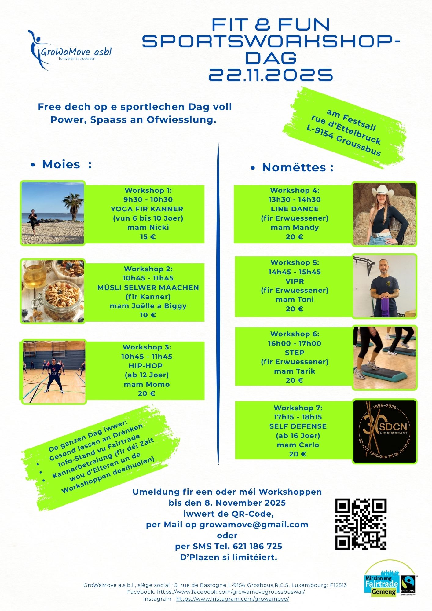Join us for an exceptional day dedicated to sport and well-being! Whether you're a beginner or an enthusiast, we offer a variety of workshops for all tastes, levels, and ages: