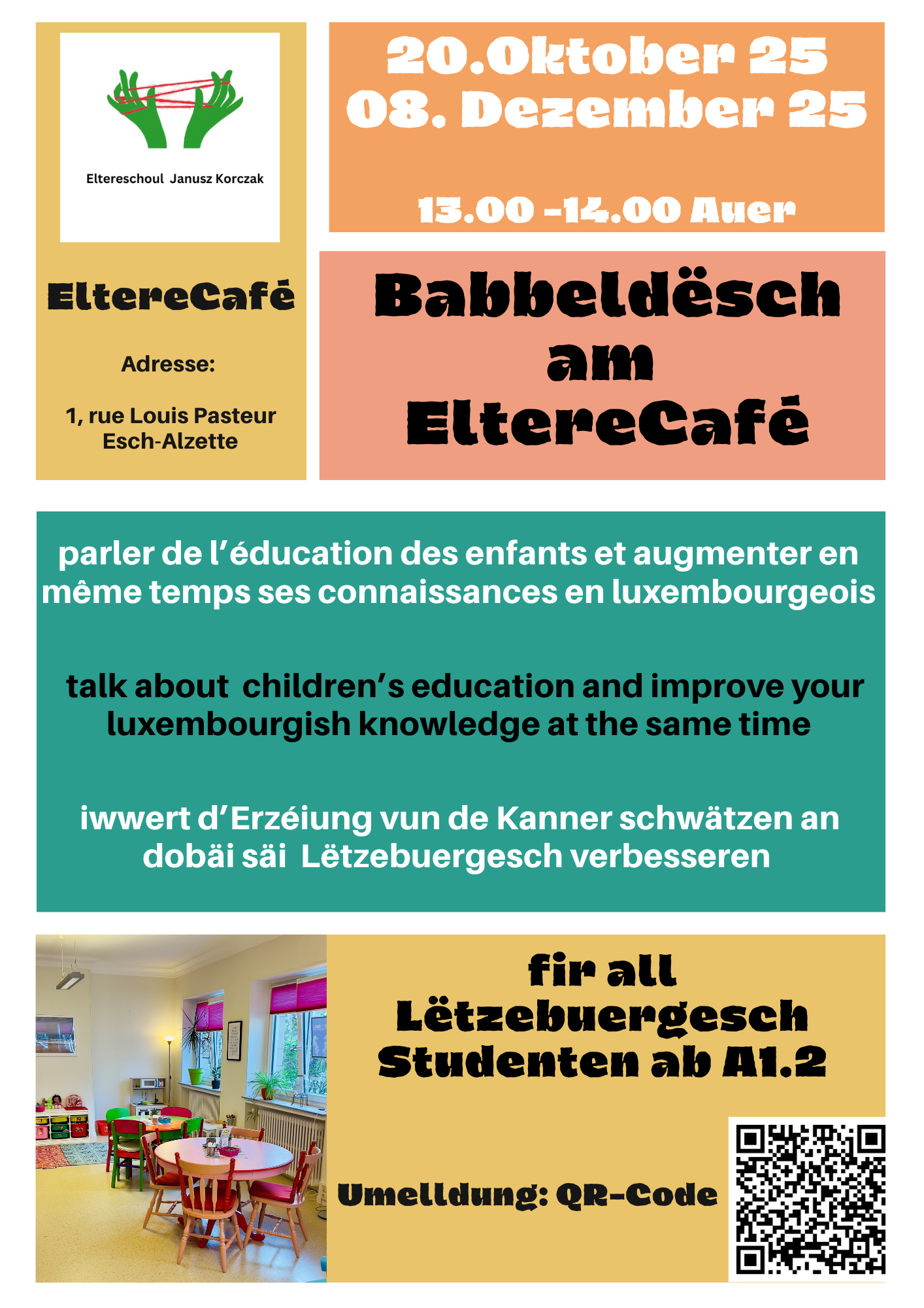 Would you like to discuss children's education while improving your Luxembourgish language skills? Join us at the Discussion Table at the Parents' Café! The Parents' Café provides a pleasant setting to explore parenting challenges, connect with other parents, share tips, and stay informed, all while enjoying a friendly and relaxing moment.