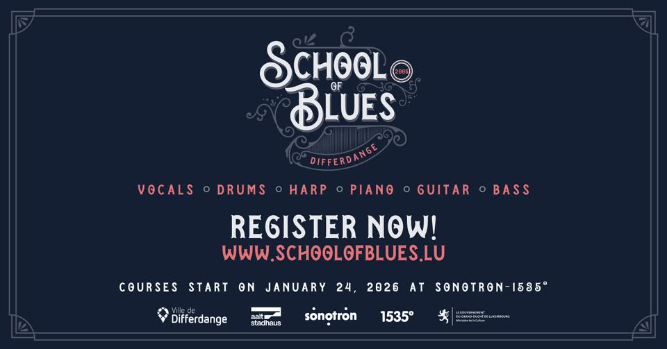 The School of Blues celebrates its 20th anniversary! For two decades, it has introduced enthusiasts to the art of blues in a relaxed and friendly environment. Join advanced music workshops led by iconic figures of Luxembourgish blues, covering harmonica, guitar, vocals, and drums.