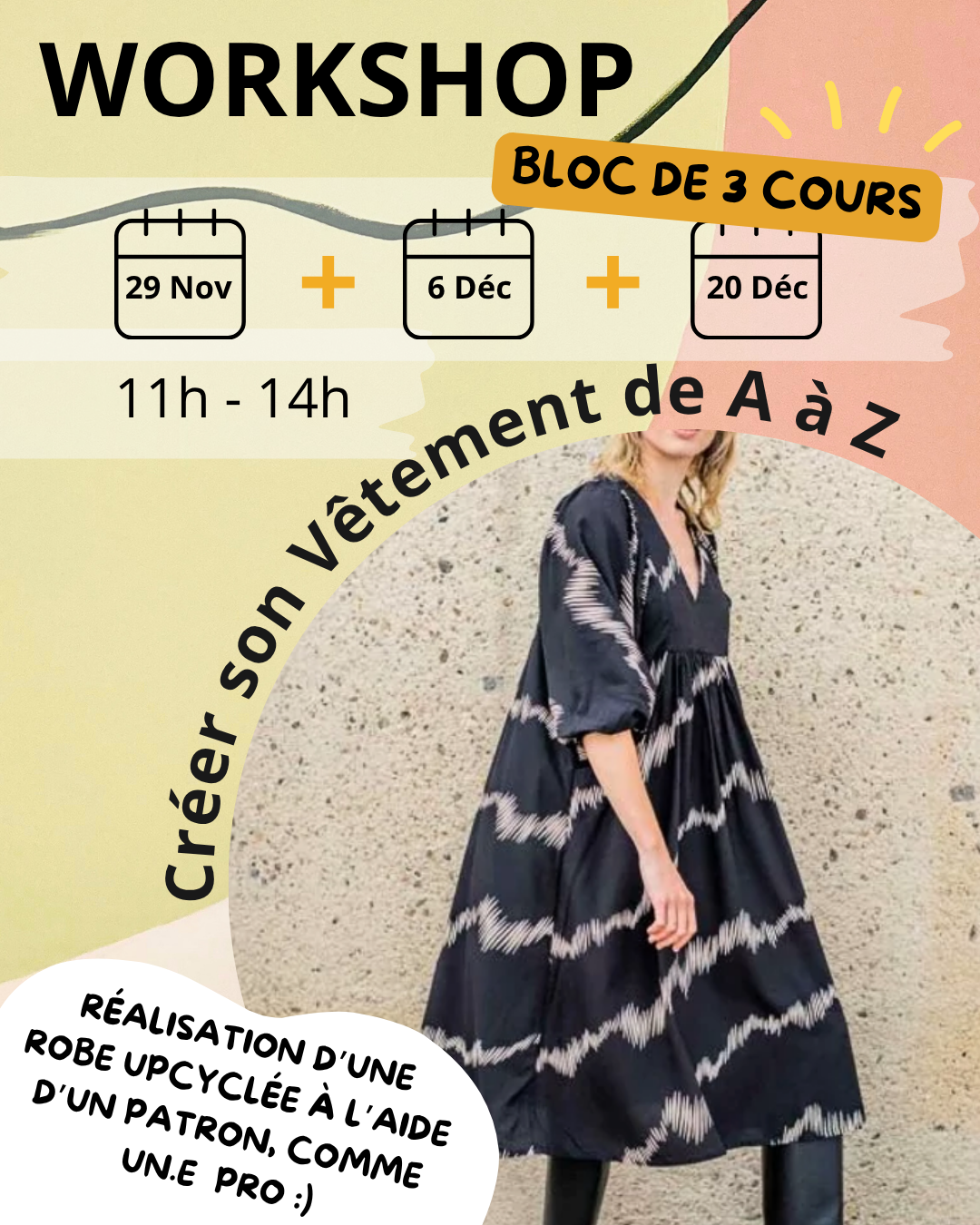 Block of 3 workshops where you'll learn to create an upcycled dress using a pattern, like a professional. The fabrics used are sourced sustainably, with all materials adapted for responsible use.