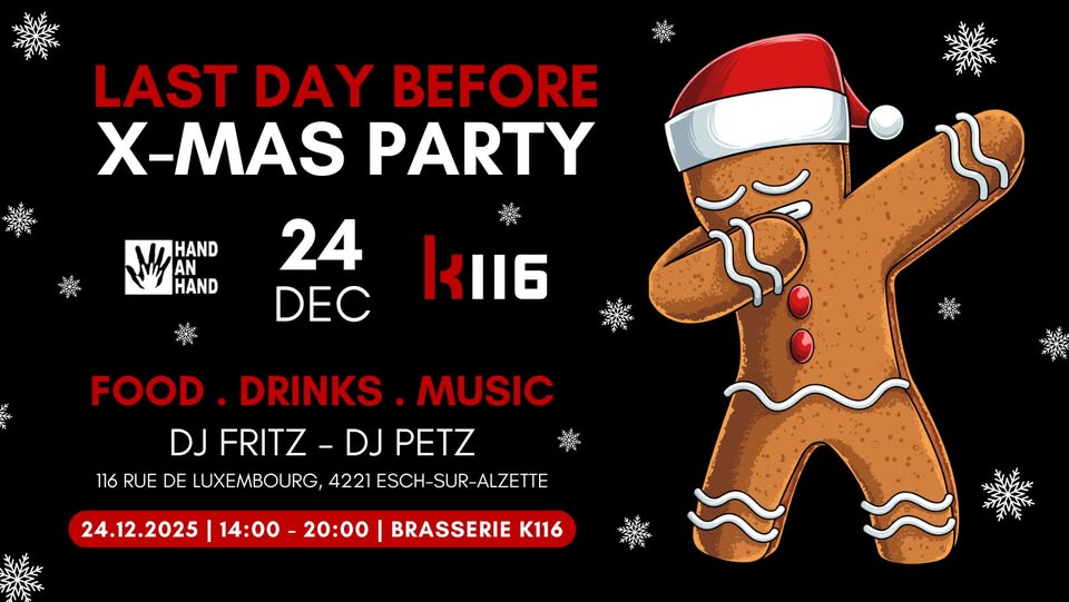 Date: Tuesday, December 24th, 2025. Time: 14:00 - 20:00. Location: Brasserie K116, 116 Rue de Luxembourg, 4221 Esch-sur-Alzette. No reservation needed.