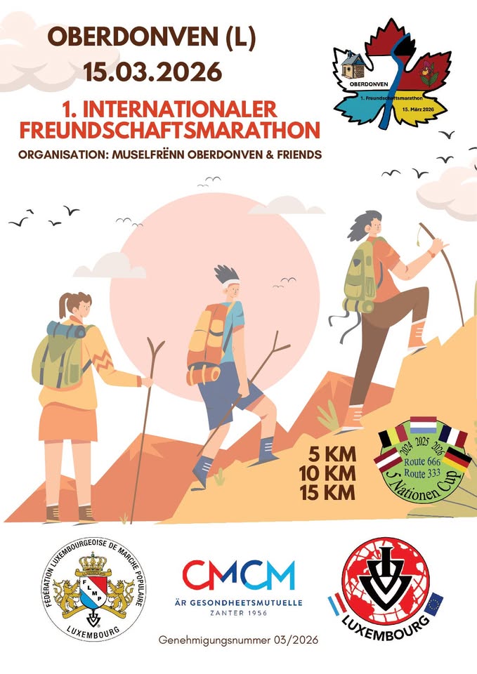 Join an exciting event organized by Muselfrenn Oberdonven asbl, including hikes of 5, 10, 15 km and a 42 km marathon. Starting point: Centre Culturel, 2 rue Méchtem, L-5435 Oberdonven.