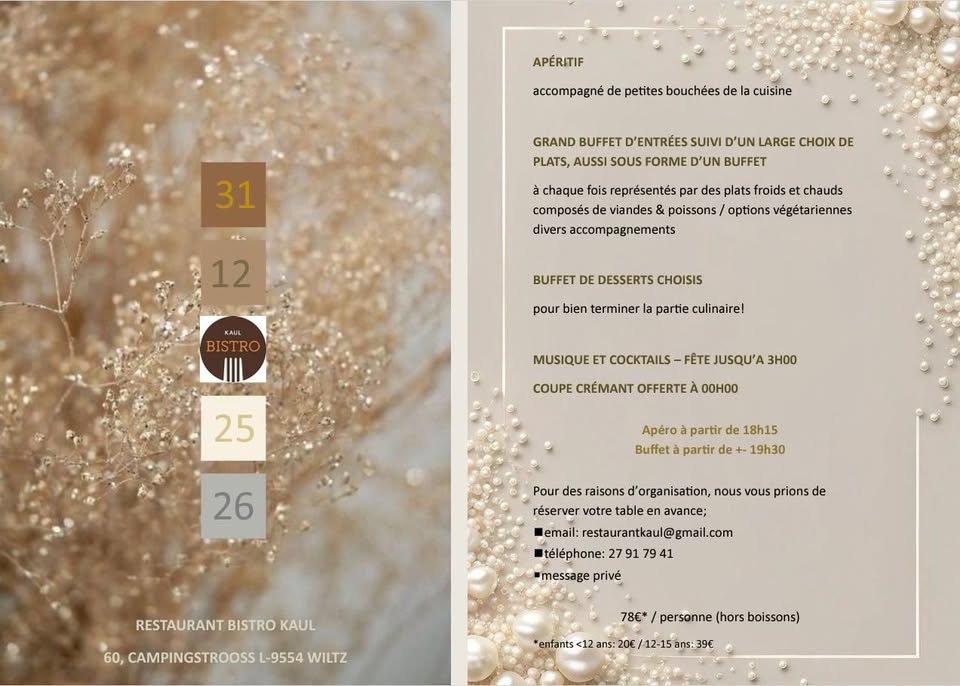 Enjoy an aperitif followed by a sumptuous buffet of appetizers featuring a wide selection of cold and hot dishes: meats, fish, and vegetarian options, paired with various sides. Conclude delightfully with a buffet of exquisite desserts. The evening will continue with music, cocktails, and a festive atmosphere until 3 AM. A glass of crémant will be offered at midnight.