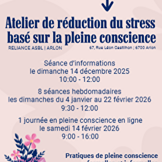 • 2026-02-08 09:30:00 2026-02-08 10:30:00 Europe/Paris Mindfulness-based stress reduction workshop - 8 weekly group sessions (Sundays) - 1 day of mindfulness (Saturday) - Formal and informal mindfulness practices - Sharing experiences - Home practices We are committed to making all practices accessible to everyone. That is why we offer several rates from which you can choose, with full awareness, according to your current financial situation. We believe that no financial difficulty should prevent the benefits of such practices. If this applies to you, please contact us so we can find a solution ;-) Rue Léon Castilhon 67, Arlon, Belgique Reliance ASBL