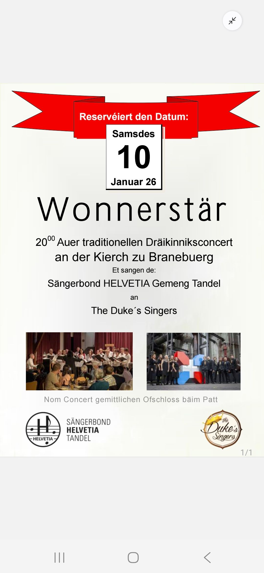Traditional Concert 'Dräikinniksconcert' by Sängerbond Helvetia at the church in Branebuurg. This year, guest performers: 'The Duke's Singers'.