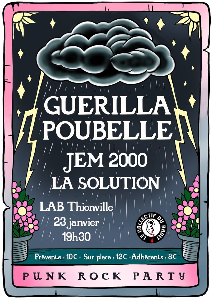 Le Collectif du Bruit presents a concert with Guerilla Poubelle, Jem2000, and La Solution, providing a night of vibrant and dedicated punk rock music.