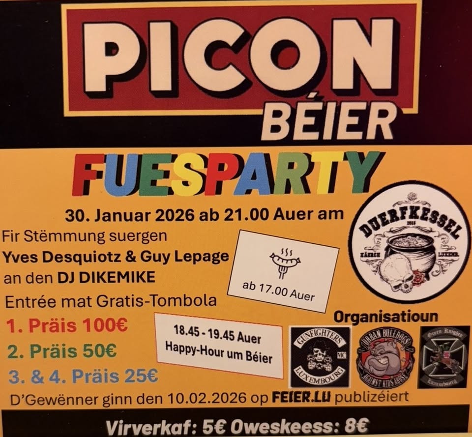 • 2026-01-30 21:00:00 2026-01-30 22:00:00 Europe/Paris Picon Beer Party Costume party with Yves Desquiotz and Guy Lepage, accompanied by DJ Dikemike. Rue de Windhof 2, 8384 Koerich, Luxembourg Duerfkessel Koerich