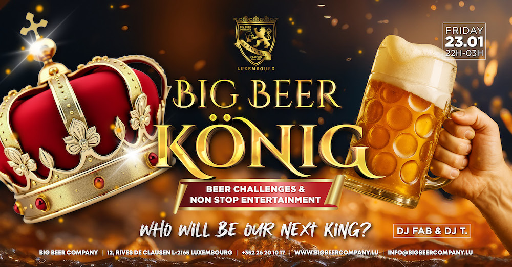 • 2026-01-23 22:00:00 2026-01-23 23:00:00 Europe/Paris Big Beer King BIG BEER KÖNIG Who will be our next King of Beer? Beer challenges and non stop entertainment. Win the battle and become the choosen one! There will only be one Big Beer König of the month! Long live the Big Beer König! 12 Rives de Clausen, 2165 Luxembourg Brauerei - Big Beer Company