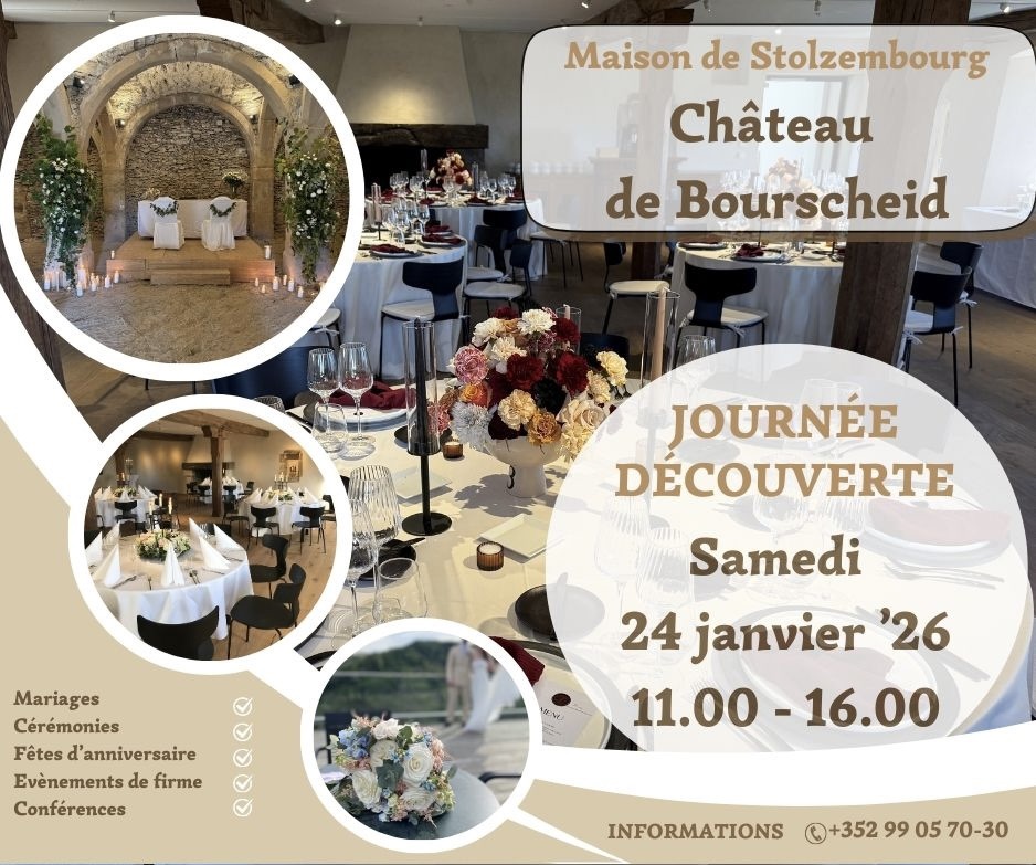 Come on Saturday, January 24, 2026, to discover how you can celebrate your event at Bourscheid Castle. The team will be present from 11:00 am to 4:00 pm to help you plan your celebration.