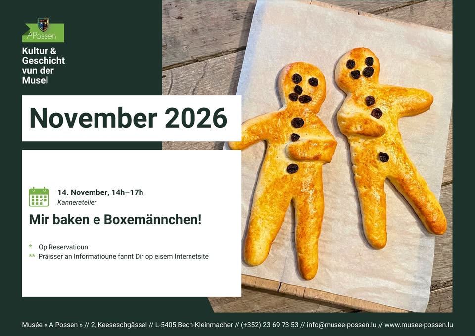 • 2026-11-14 14:00:00 2026-11-14 17:00:00 Europe/Paris We make a Boxemännchen! Children aged 6 to 12 will have the opportunity to enjoy a creative and culinary afternoon at the "A Possen" museum by making their own "Boxemännchen". With the help of our mediator, they'll prepare a creamy dough made from curd cheese, roll it out, and cut out their little men in the traditional shape. Then, each child can unleash their imagination and decorate their "Boxemännchen" with raisins and a small clay pipe. After baking, the pastries will be carefully packed in a self-decorated bag, so they arrive home intact. A workshop where creativity, fun, and delicious treats come together! 2, Keeseschgaessel, 5404 Bech-Kleinmacher, Luxembourg Musée A Possen