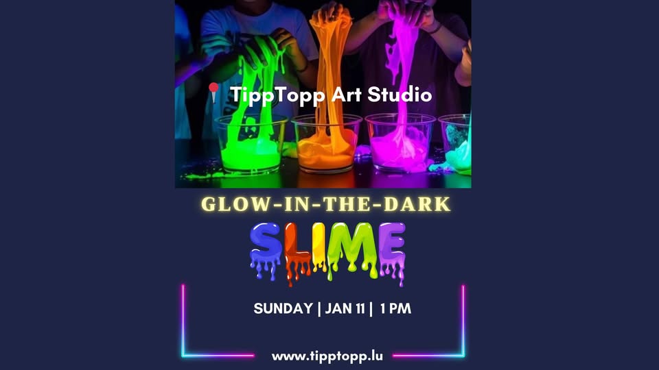 • 2026-01-11 13:00:00 2026-01-11 14:30:00 Europe/Paris Glow-In-The-Dark Slime Workshop Join a fun and creative workshop where children aged 5 and up will craft their own glow-in-the-dark slime with sparkling decorations and make glowing bracelets. All materials are provided, and participants get to keep what they create. The workshop is supervised so kids can fully enjoy the experience while parents take a break. 11, Côte d'Eich, Luxembourg, Luxembourg Tipptopp