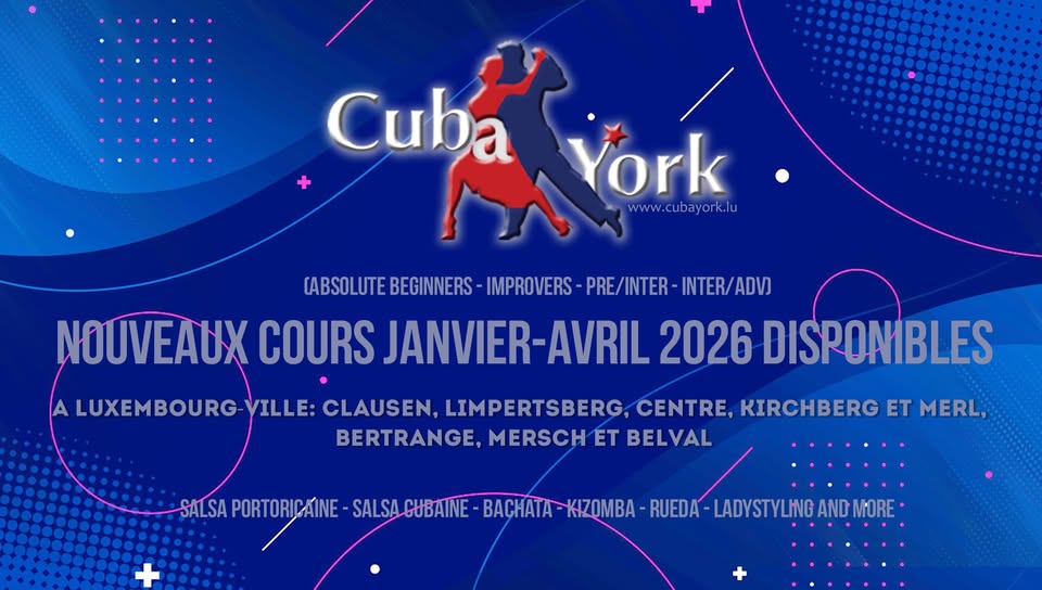 Classes take place every day from Sunday to Thursday. Locations: Rives de Clausen (Luxembourg City), Merl/Helfenterbreck/Bertrange, Limpertsberg (Luxembourg City), Kirchberg (Luxembourg City), Mersch, Belval. All levels and dance styles available. Contact by email or WhatsApp.