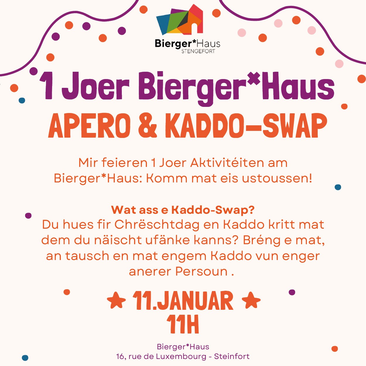 1 Joer Bierger*Haus asbl - Apéro & Kaddo-Swap
