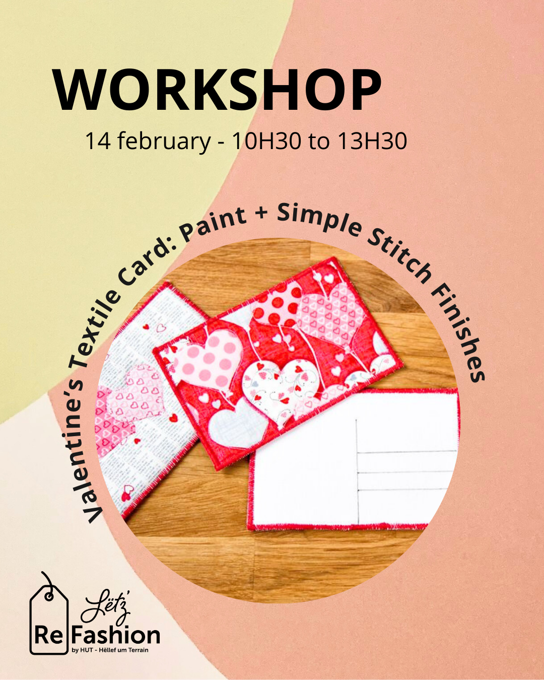 • 2026-02-14 10:30:00 2026-02-14 13:30:00 Europe/Paris Valentine’s Textile Card: Paint + Simple Stitch Finishes Create a unique textile card for Valentine’s Day to gift to a loved one! In this workshop, you paint a small abstract or symbolic design on a fabric square, then add simple hand stitches (running stitch, cross stitch, or border details) for texture and dimension. The fabric is then mounted on rigid paper or lightweight cardboard, transforming it into a modern, tactile card—perfect for gifting or framing. Beginner-friendly workshop. 8-10 Rue Genistre, 1623 Ville-Haute Luxembourg Lët'z Refashion by HUT