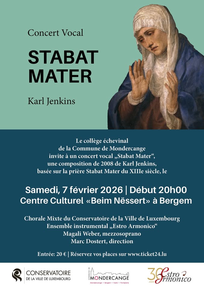 • 2026-02-07 20:00:00 2026-02-07 21:00:00 Europe/Paris Stabat Mater vocal concert The municipal council of Mondercange invites you to a vocal concert "Stabat Mater", a 2008 composition by Karl Jenkins based on the 13th-century Stabat Mater prayer. With the participation of the Mixed Choir of the Conservatory of the City of Luxembourg, the instrumental ensemble Estro Armonico, Ms. Magali Weber (mezzo-soprano), and Mr. Marc Dostert (conductor). Centre Culturel ,,Beim Nëssert‘‘, Rue de Schifflange, Bergem Mondercange, Luxembourg Gemeng Monnerech