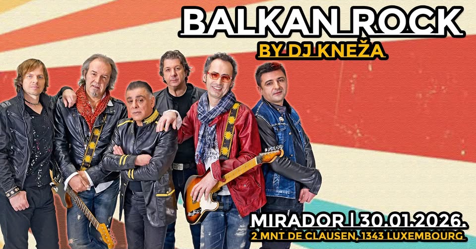 • 2026-01-30 21:00:00 2026-01-30 22:00:00 Europe/Paris Balkan Rock by DJ Kneža @ Mirador Get ready for a night of pure rock energy straight from the Balkans! At the Balkan Rock Party with DJ Kneža, dance and sing along to legendary bands like Azra, EKV, Električni Orgazam, Bijelo Dugme, Riblja Čorba, Idoli, Haustor, Prljavo Kazalište, Šarlo Akrobata, Bajaga, Boa, Van Gogh, Pips, Chips & Videoclips, Parni Valjak, Aerodrom, Film, Zabranjeno Pušenje, Balašević, Yu Grupa, Majke, Psihomodo Pop, Hladno Pivo, Let 3, Partibrejkers, Kawasaki 3P, S.A.R.S., Dubioza Kolektiv, Brkovi, Kud Idijoti and many more! Enjoy the biggest hits from the ex-Yu rock scene, from 80s classics to modern favorites. 2 Montée de Clausen , 1343 Luxembourg, Luxembourg Mirador