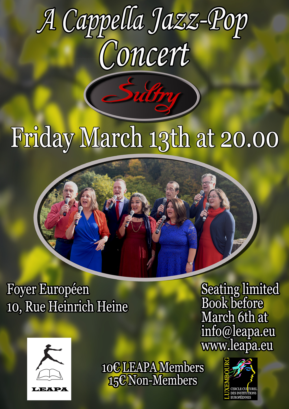 Sultry returns to the Foyer européen in Luxembourg thanks to the LEAPA association and invites you to share our enjoyment of singing together. After our recent performances at Christmas markets and the release of our latest music video (Take Me Home) in December, we are eager to sing in this more intimate setting. We hope to see you there.