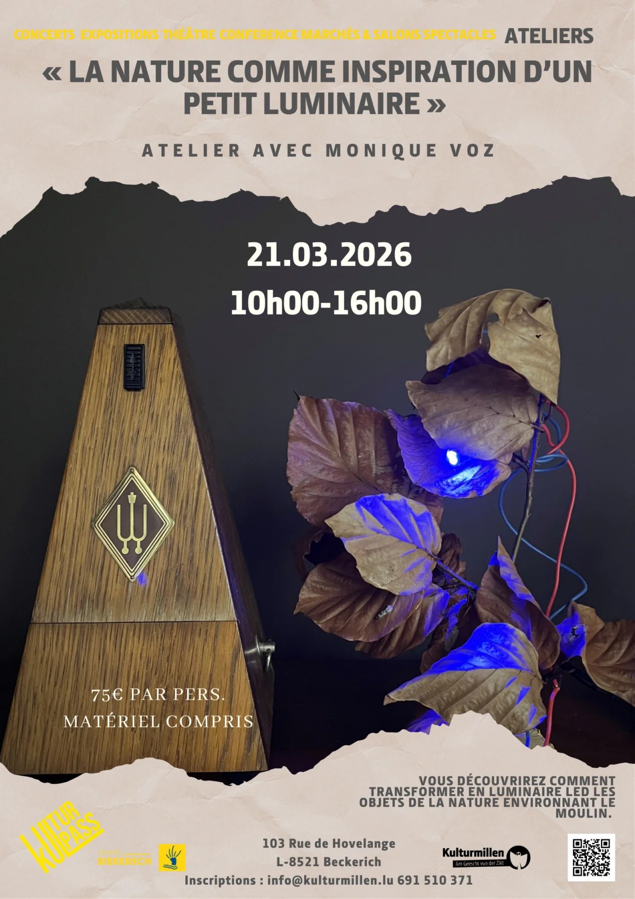 Discover how to transform objects from the mill's natural surroundings into LED lamps in a workshop led by Monique Voz. With simple guidance, Monique will introduce you to the world of creative electronics.