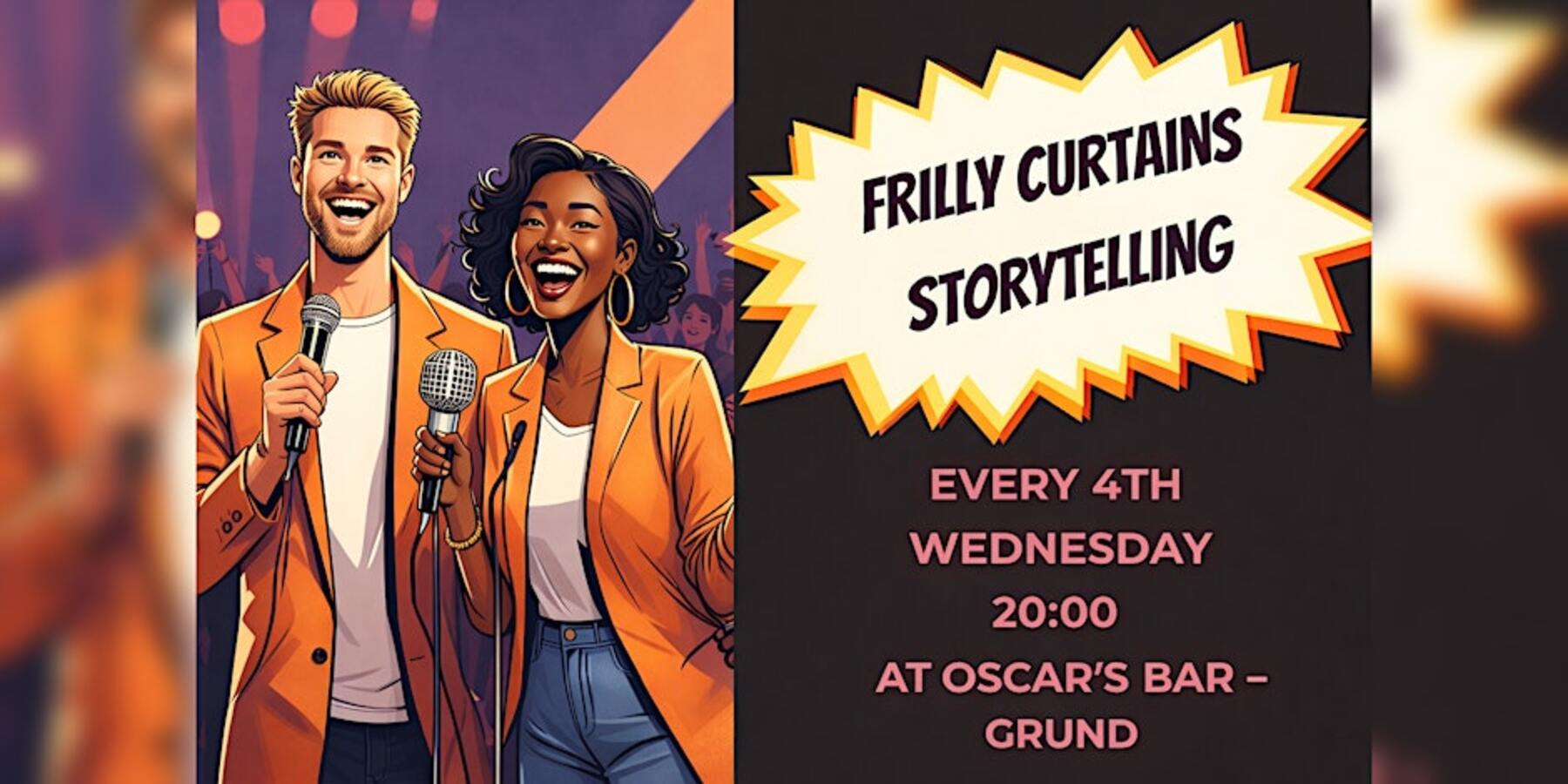 Frilly Curtains Comedy: Join us the 4th Wednesday of the month for an eventful night of storytelling. Our stories may be funny, tragic, offbeat, or tales of woe. You will always be surprised. Frilly Curtains Comedy is diverse and eclectic, welcoming everyone from all backgrounds.