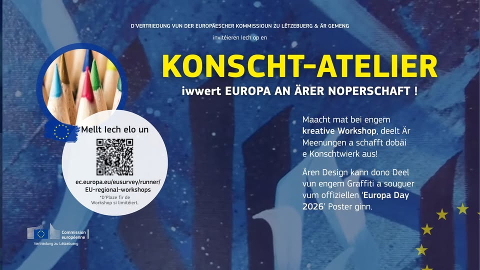 Registration required via the online platform. Workshops are mainly held in Luxembourgish. Participants will be selected to ensure a diversity of experiences and perspectives in each region. On May 9, an EU-supported projects quiz will be organized, and the campaign concludes on May 10 on Europe Day in Wiltz.