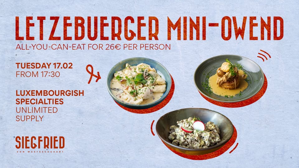 Fancy some tasty Luxembourgish food? You can have as much as you'd like with our special all-you-can-eat formula. 4 different typical local dishes are waiting for you with unlimited refills for €26 per person.