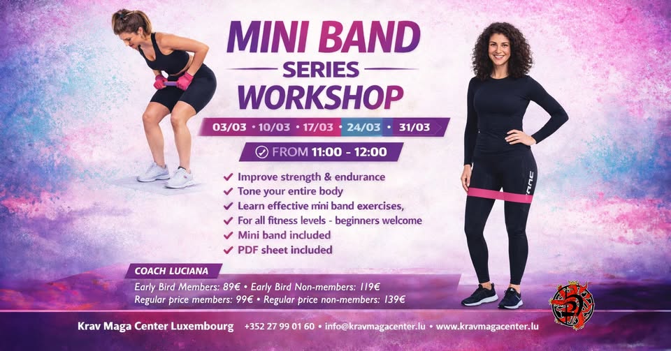 Full body training with mini resistance bands led by Coach Luciana at Krav Maga Center Luxembourg. This program is suitable for all fitness levels and helps you strengthen, tone and stabilize your entire body using simple mini bands.