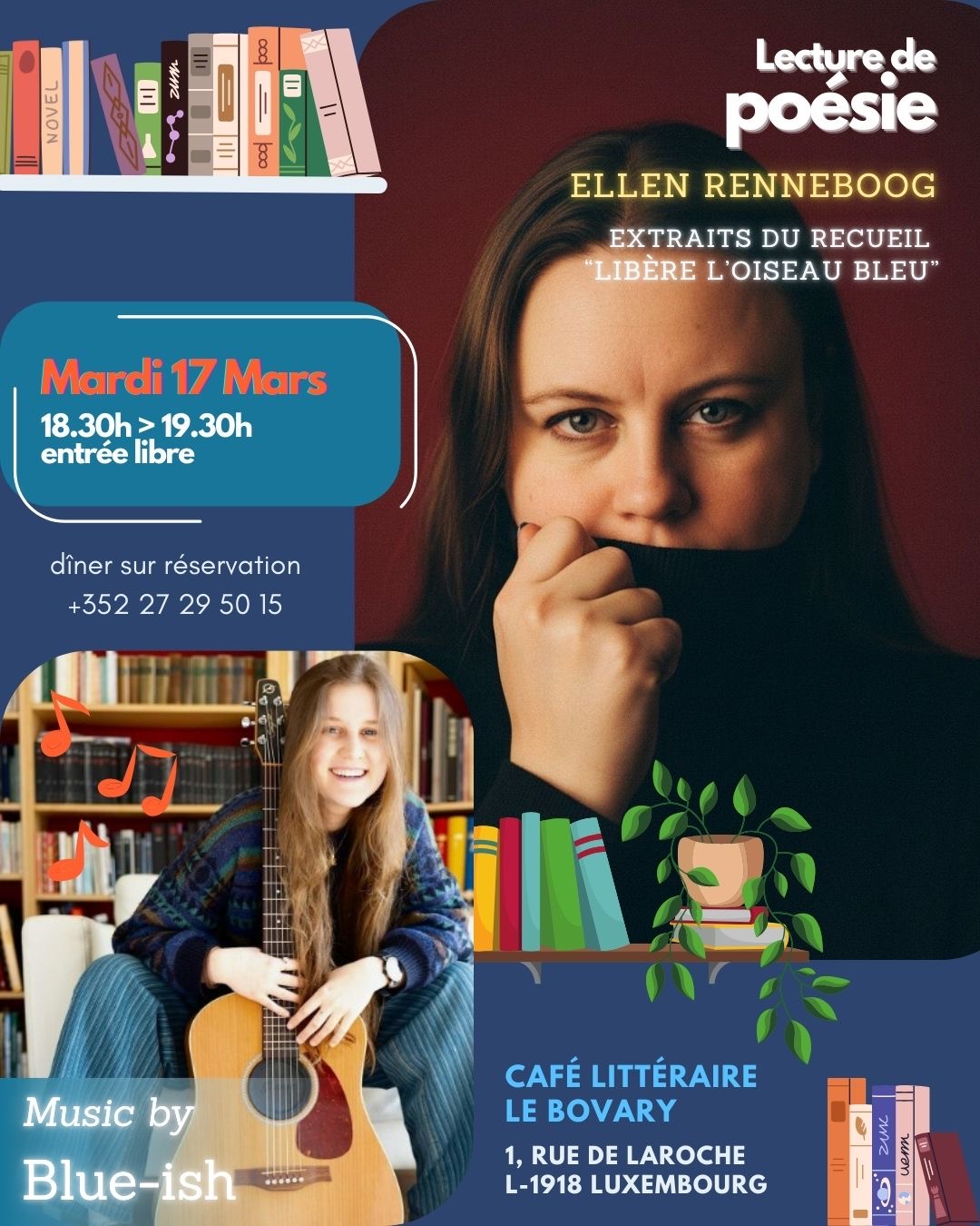 Ellen Renneboog will read excerpts from her collection "Free the Bluebird," published by Phi. Musical accompaniment by Blue-ish (vocals and acoustic guitar). Free admission. Dinner can be booked afterwards.