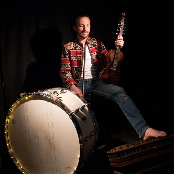 Rubbed, scraped, or struck, his violins remain his most faithful companions. At his feet, you'll find a brass band bass drum, a travel trunk, and even a bass accordion pedalboard. There's no doubt about it, you're dealing with a one-violin band!