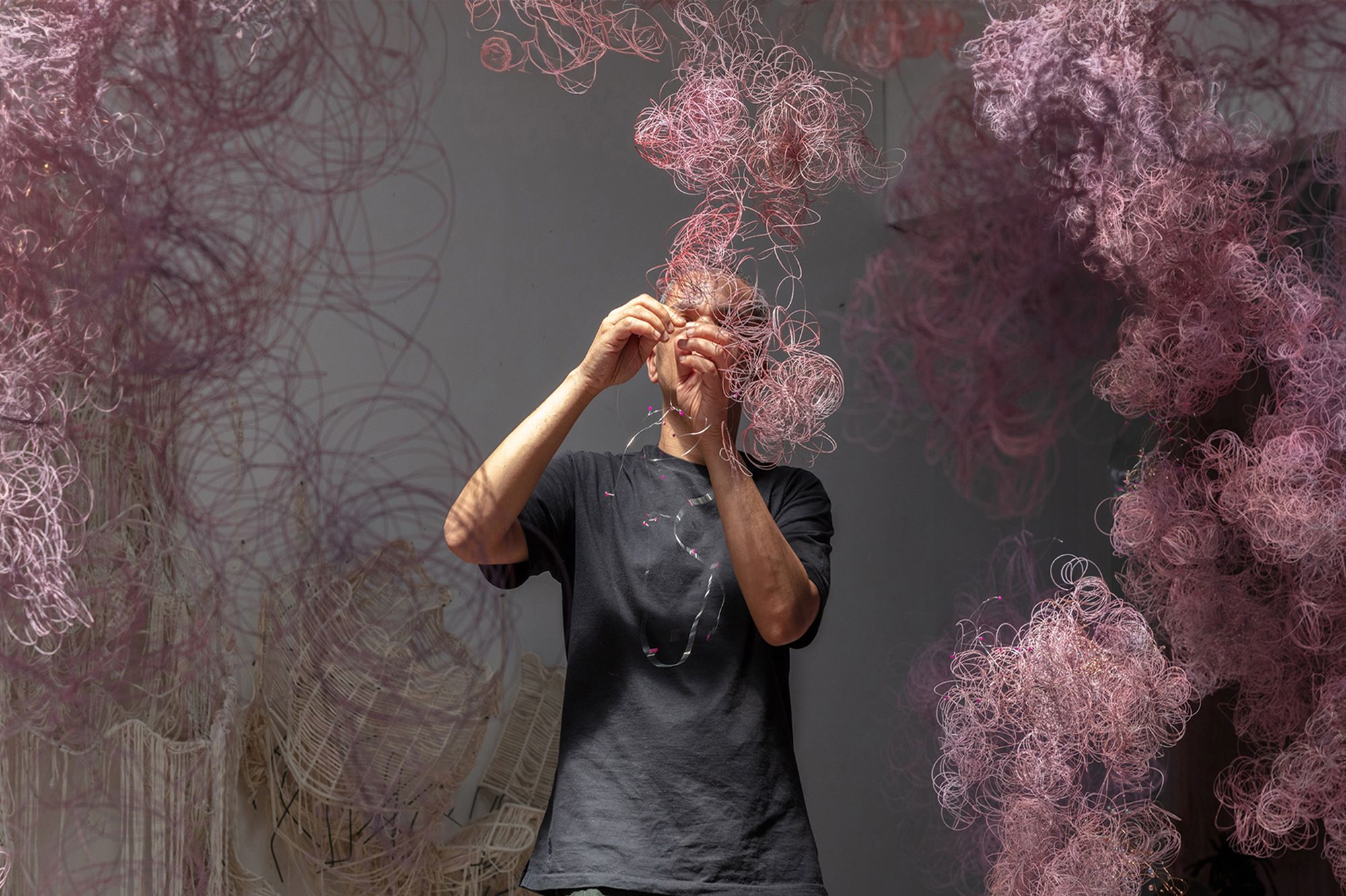 The exhibition begins with an expansive installation of textile swatches, which visitors are invited to touch, immersing them into Adams’ studio environment. His signature tapestries and ‘cloud’ sculptures are presented alongside his dance prints, shown here for the first time on a large scale. Together, they form a silent choreography that turns movement into a language of liberation.