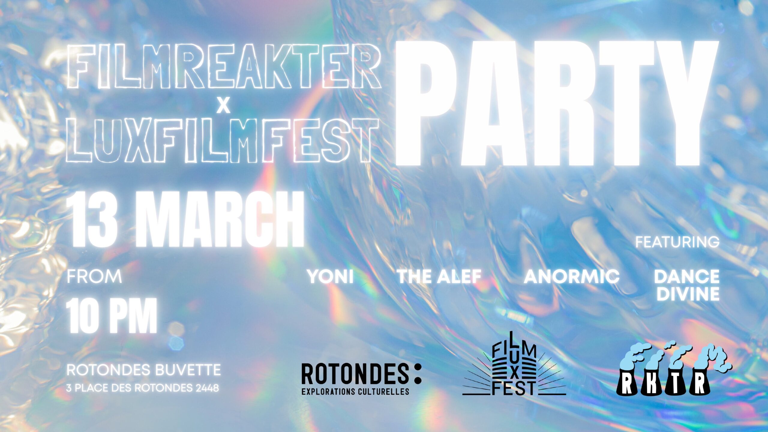 After the first Filmreakter screenings of Lost Weekend (7th edition), Quickies (season 3), Juvenile Productions (season 1), the film Les 100 Pas and the traditional Cinélunatique screening, Filmreakter invites participants, festival guests and film lovers to party together with drinks and DJ sets all night long at the Rotondes Buvette, from 10 p.m. until the early morning.