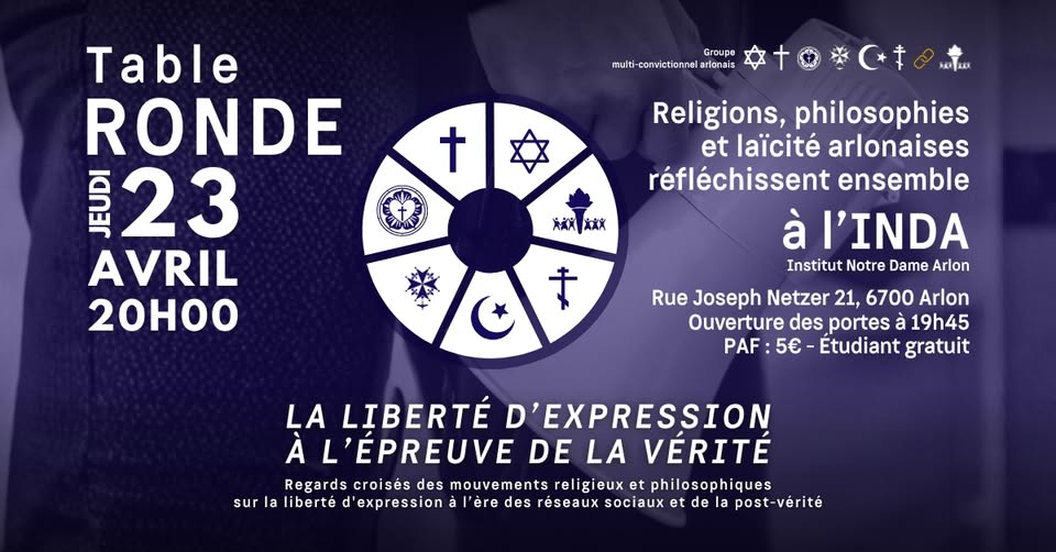Religions, philosophies, and secular movements in Arlon are gathering to reflect on the topic: Freedom of Expression Tested by Truth. Perspectives from religious and philosophical movements on freedom of expression in the age of social networks and post-truth.