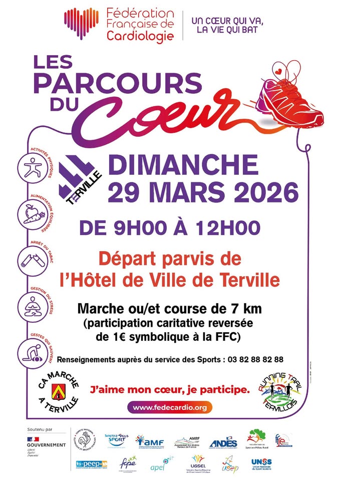 The associations Ça Marche à Terville and Running Trail Tervillois, in partnership with the Municipality of Terville and initiated by the French Federation of Cardiology, invite you to participate in the Heart Walk.