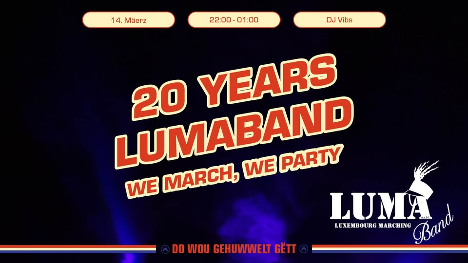 • 2026-03-14 22:00:00 2026-03-14 23:00:00 Europe/Paris 20 Years Lumaband We have to celebrate! On March 14, it’s finally happening – the BIG Lumaband Party is on! Come by, march, dance and celebrate with us for an unforgettable night full of music, energy and great vibes! Let’s make this anniversary one to remember! Schräinerei Schräinerei