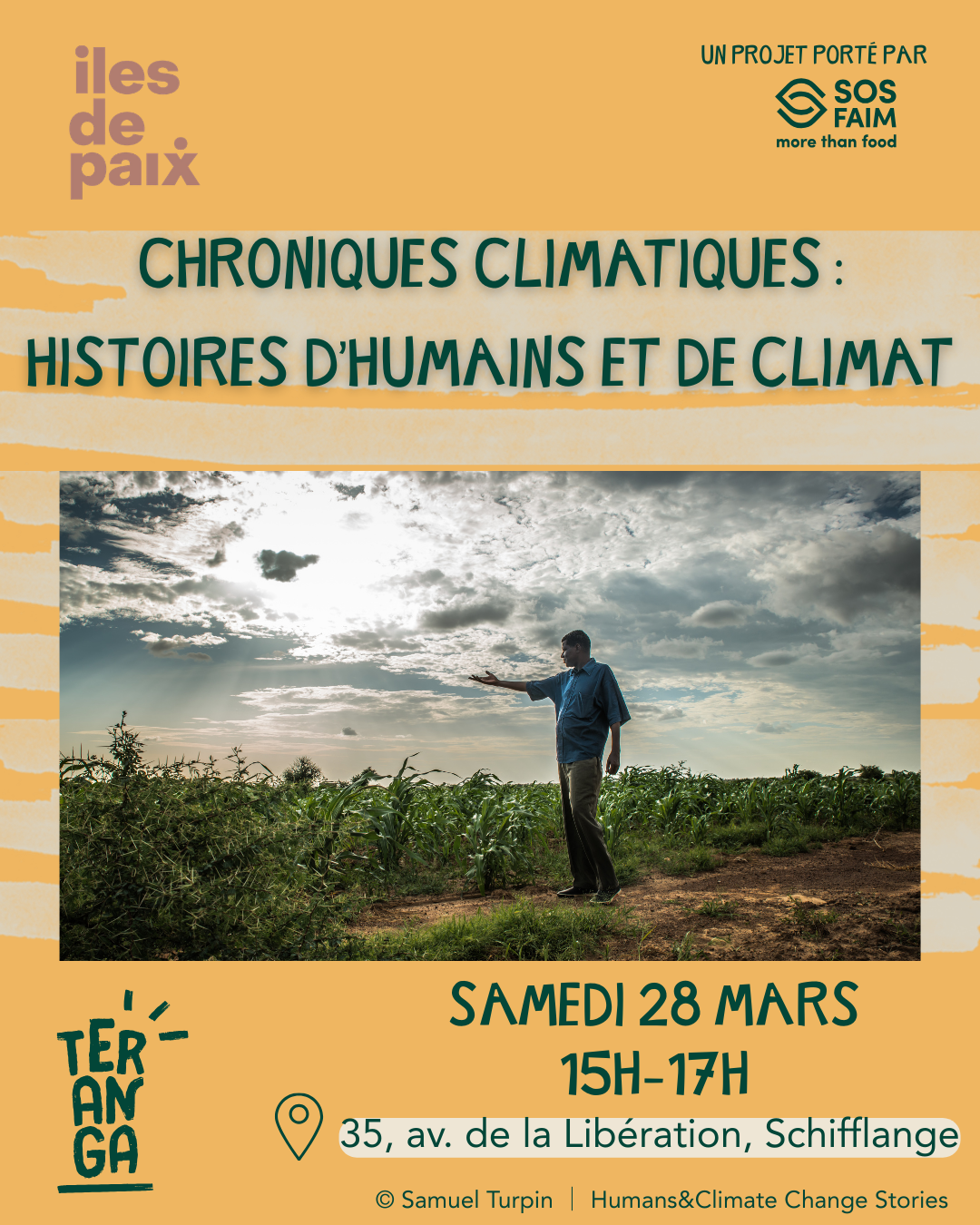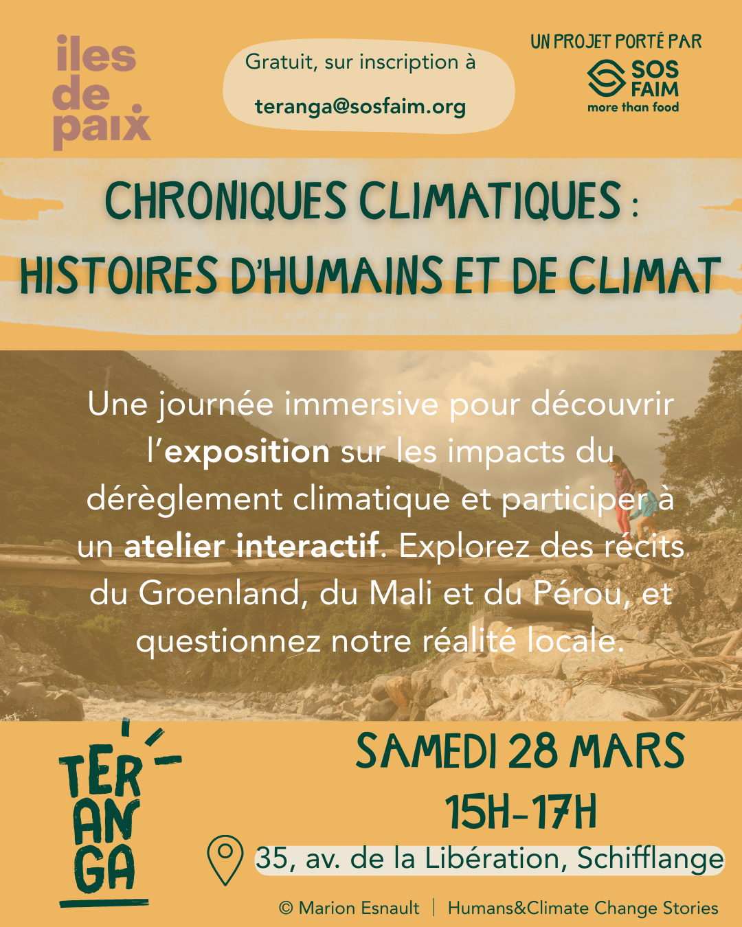 • 2026-03-28 15:00:00 2026-03-28 17:00:00 Europe/Paris Climate Chronicles: Stories of Humans and Climate Dive into an immersive day dedicated to the human stories behind climate change 🌍 Discover the “Humans and Climate Change Stories” exhibition and join an interactive workshop (FR) to explore, question, and take action. From Greenland to Mali to Peru, powerful stories that echo our own local realities and inspire reflection ✨ This event is organised in collaboration with Iles de Paix, an association committed to working alongside citizens to defend the rights of farmers and to promote the right to food for all, through agroecological transition. To learn more, feel free to take a look: https://www.ilesdepaix.org/ TERANGA - Maison de la transition alimentaire, Avenue de la Libération, Schifflange, Luxembourg TERANGA - Maison de la transition alimentaire