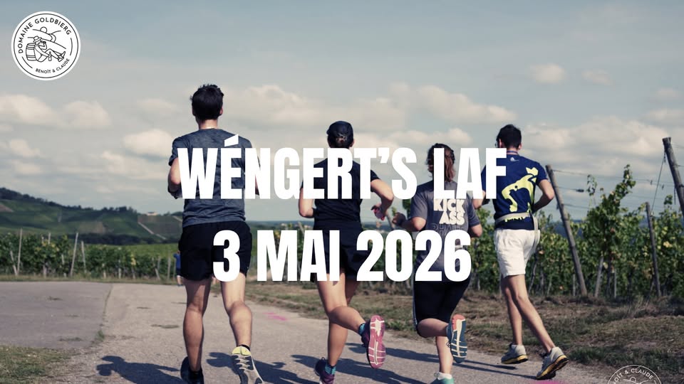• 2026-05-03 11:00:00 2026-05-03 12:00:00 Europe/Paris Wéngert's Laf - 3 May 2026 Join us for Wéngert’s Laf, a charming folkloric run or walk through the beautiful vineyards of Remich and Schengen. Take in breathtaking scenic views while diving into the region’s winemaking culture. Along the route, there will be five stops hosted by local winemakers offering exclusive wine tastings and gourmet appetizers, all set to live music throughout the day. Don’t miss this unique experience in the heart of the vineyards! Domaine Goldbierg - Benoit & Claude Wéngert's Laf