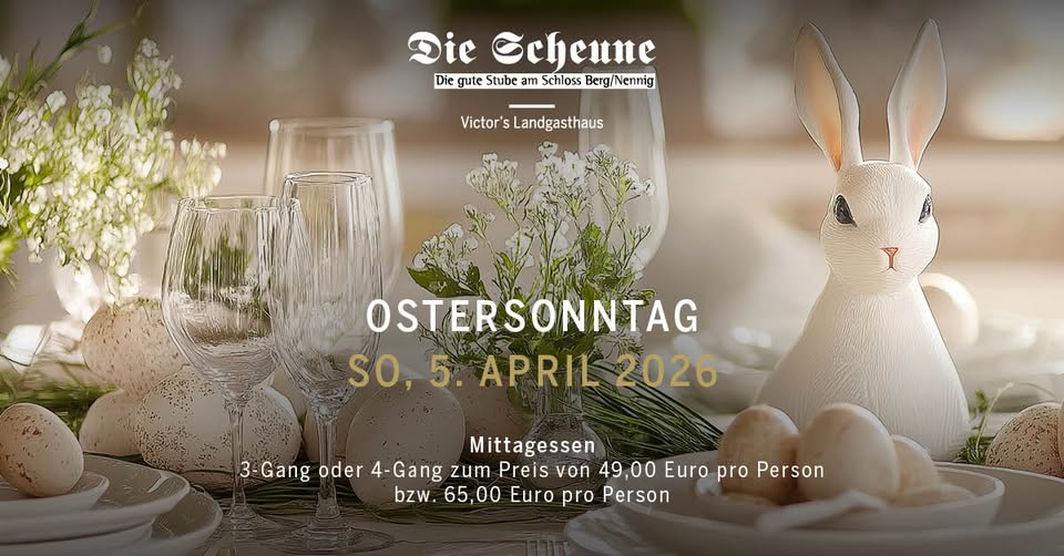 • 2026-04-05 11:00:00 2026-04-05 12:00:00 Europe/Paris Easter Sunday at Victor's Landgasthaus Die Scheune Celebrate Easter Sunday with a festive lunch at Victor's Landgasthaus Die Scheune. Enjoy a carefully curated 3- or 4-course menu welcoming spring in a cozy and relaxed atmosphere. Schloßstr. 27 -29, 66706 Perl, Germany Victor's Residenz-Hotel Schloss Berg