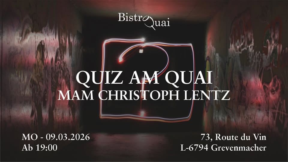 It's time for our quiz at the Quai! Register with your team of 2 to 8 people. As always, there are plenty of great prizes to win.
