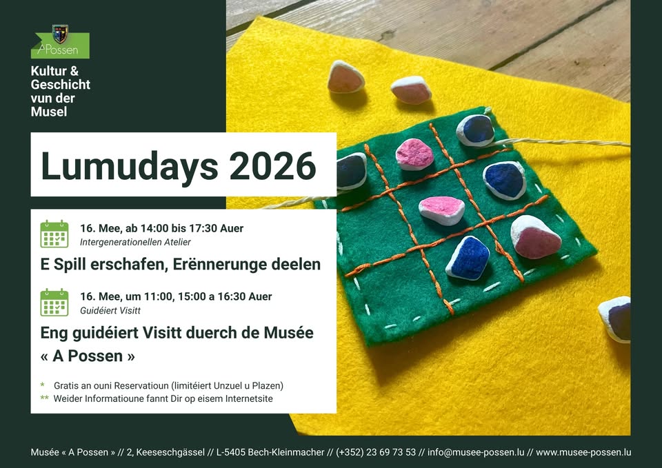 As part of the Luxembourg Museum Days, the Musée A Possen, in collaboration with ICOM Lëtzebuerg, invites you to an experience combining cultural heritage, creativity, and exchange.