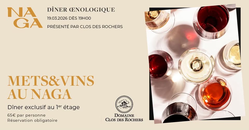 • 2026-03-19 19:00:00 2026-03-19 20:00:00 Europe/Paris Wine Dinner Naga x Clos des Rochers On March 19 at 7pm, Naga is pleased to welcome Clos des Rochers for an exceptional gastronomic evening featuring a food and wine pairing dinner, on the restaurant's upper floor. Menu & Pairings: - Aperitif: Domain presentation, Clos des Rochers – Crémant de Luxembourg Brut - Appetizer: Shiitake and Jerusalem artichoke skewer, borage flowers, Clos des Rochers – Fleur des Rochers Barrique - Starter: Sautéed asparagus, parmesan mousse, cheese biscuits, Clos des Rochers – Riesling Ahn Palmberg - Main course: Duck breast, berry sauce, chocolate and small potatoes, Clos des Rochers – Petite Fleur des Rochers Pinot Noir - Dessert: Strawberry stew, yogurt mousse, mint biscuit, Domaine Thill – Domaine et Tradition Gewürztraminer Naga - Restaurant - Bar Naga - Restaurant