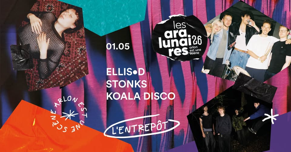 Poster for the Les Aralunaires 2026 festival in Arlon, featuring the bands ELLiS•D, Stonks, and Koala Disco.