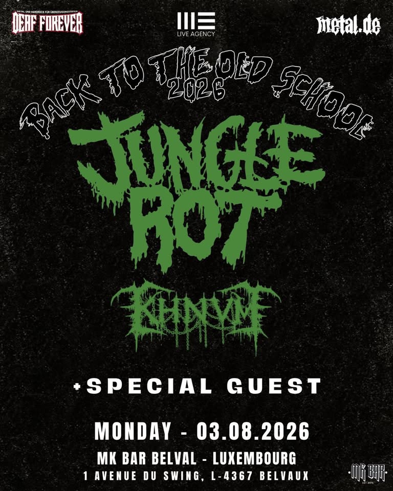 On Monday, August 3rd, 2026, Jungle Rot and KHNVM will perform at MK Bar Belval as part of their European tour "Back to the Old School." Get ready for an evening of crushing riffs and underground atmosphere.