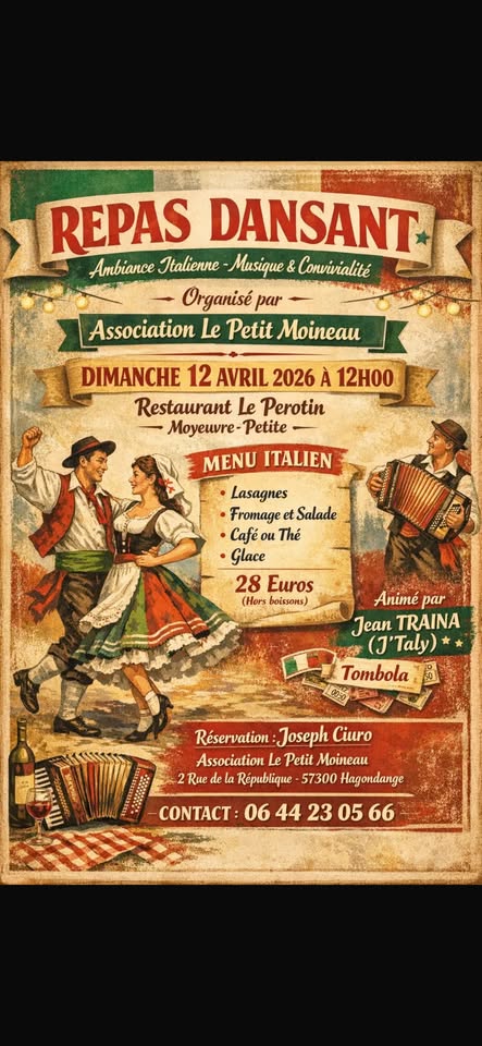 • 2026-04-12 12:00:00 2026-04-12 13:00:00 Europe/Paris Dinner dance with an Italy theme Dinner dance hosted by the unmissable Jeanne Trenat. Source du perotin Moyeuvre, Moyeuvre-Petite, France Site de Pérotin