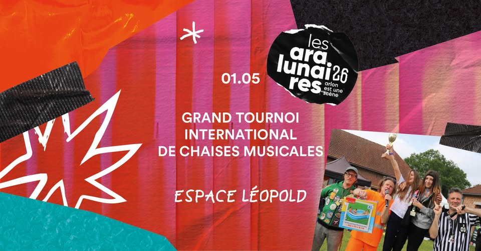• 2026-05-01 14:30:00 2026-05-01 16:15:00 Europe/Paris Grand International Musical Chairs Tournament | Aralunaires 2026 A collective, immersive, and all-out show: the Grand International Musical Chairs Tournament, originating from a joke over 12 years ago and now a major event. Three key figures lead the competition: - The referee: Jérémy Alonzi - The DJ: Hugo Freegow - The mastermind: Emeric Florence The competition includes two rounds: one for children and one for adults. A friendly and festive atmosphere for young and old, featuring original rules and unique musical entertainment. This event is part of the Les Aralunaires 2026 festival in Arlon. Place Léopold, 6700 Arlon, Belgique Les Aralunaires