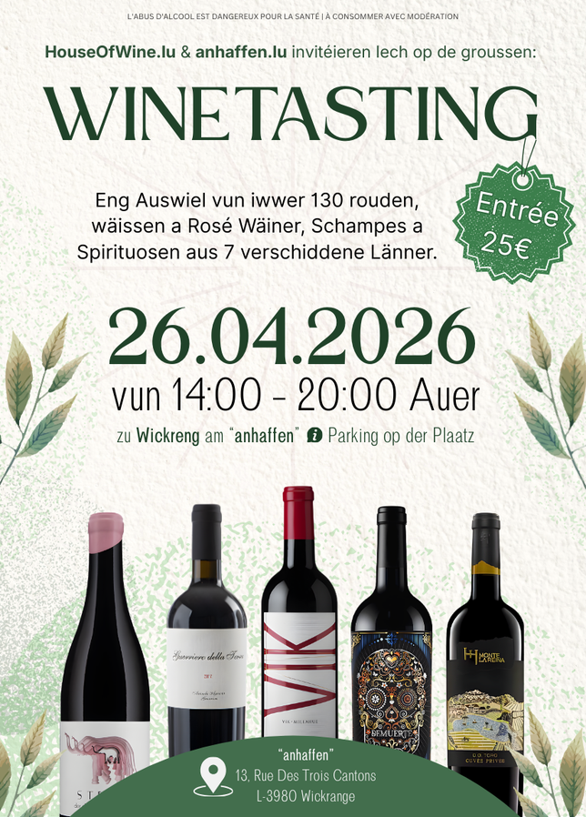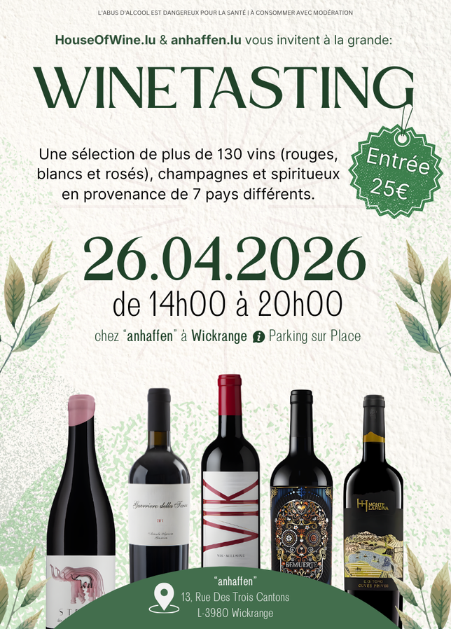 A relaxing afternoon, good company, and a selection of over 130 wines and spirits from 7 different countries, just waiting to be tasted. That's exactly what we're offering you on Sunday, April 26, 2026, in the warm and welcoming atmosphere of Anhaffen in Wickrange.