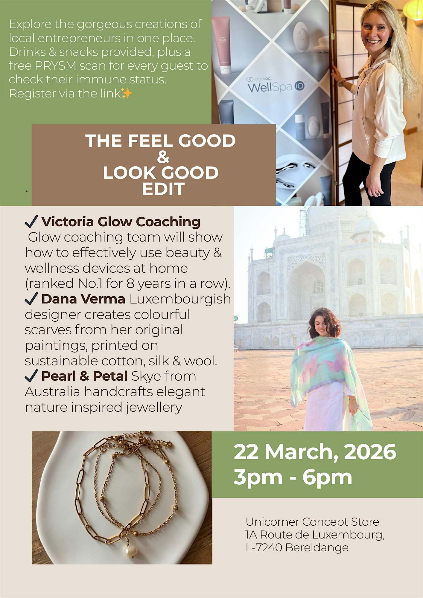 • 2026-03-22 15:00:00 2026-03-22 18:00:00 Europe/Paris The Feel Good & Look Good Edit Explore the gorgeous creations of local entrepreneurs in one place. Drinks & snacks provided. Victoria & the Glow Coaching Team From the corporate world to play cafés and now wellness coaching, Victoria focuses on beauty from within. Her team is pioneering the launch of a biohacking device in Luxembourg and India. Backed by 20+ years of research, the PRYSM scan measures antioxidant levels and provides a real-time snapshot of cellular health. Guests can also learn how to use beauty and wellness home spa devices — because consistency is key. Dana Verma Dana Verma is a Luxembourg-based designer who creates scarves from her original paintings. Printed on sustainable natural materials such as cotton, silk, and wool, her pieces bring colour and artistic charm to everyday wear. The new collection features lightweight cotton and silk scarves in a range of soft and vibrant tones, blending delicate patterns with figurative artwork. Petal & Pearl After the birth of her baby, Skye discovered a passion for creativity and founded Petal & Pearl, a handmade jewellery and accessories brand inspired by nature. Each piece is individually handcrafted in Luxembourg, combining the delicate beauty of petals with the timeless elegance of pearls. 1 A Route de Luxembourg, 7240 Bereldange Walferdange, Luxembourg Unicorner Concept Store Walferdange