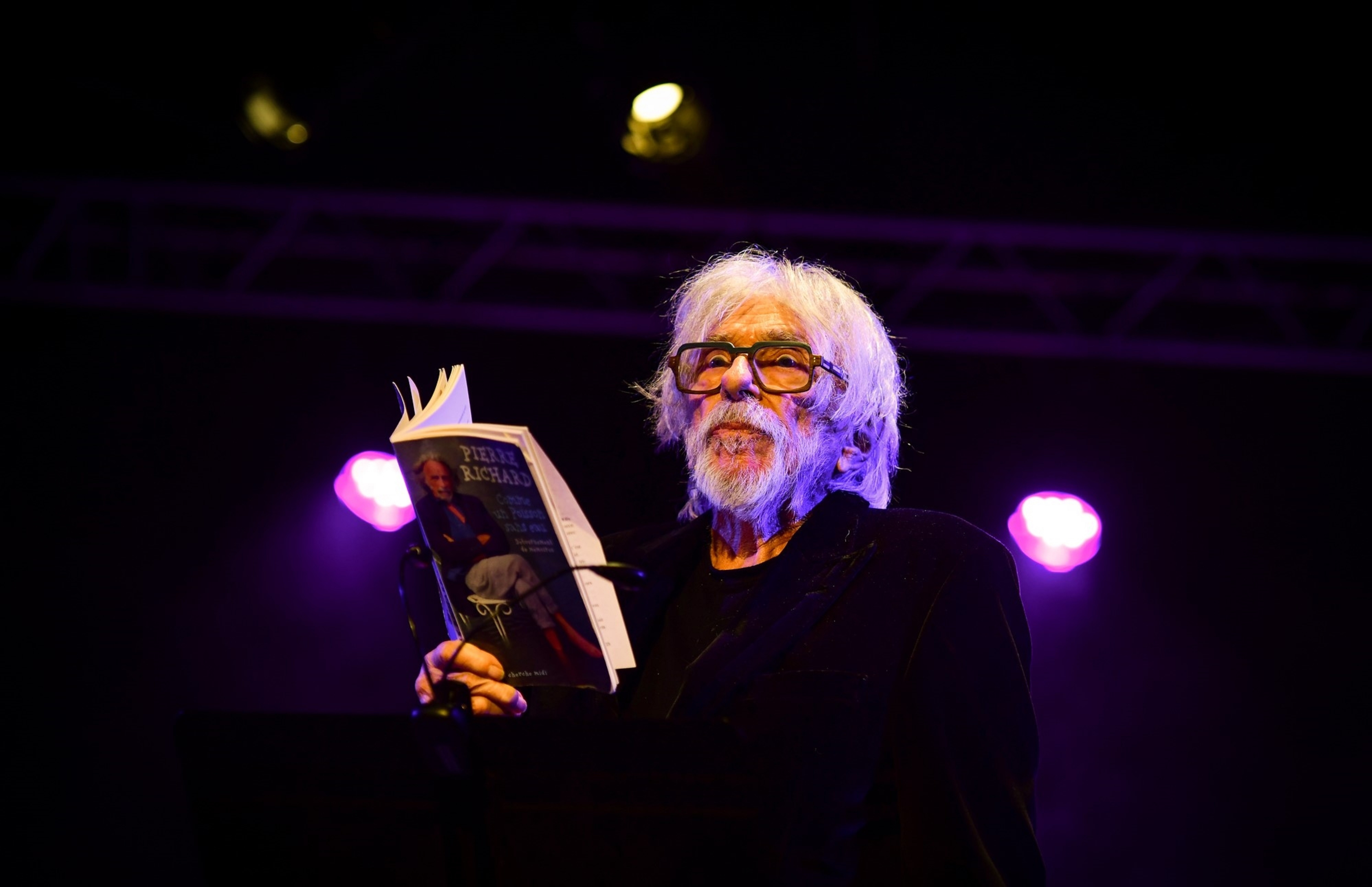 On stage, Pierre Richard shares anecdotes, musically illustrated by the group.